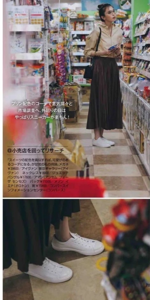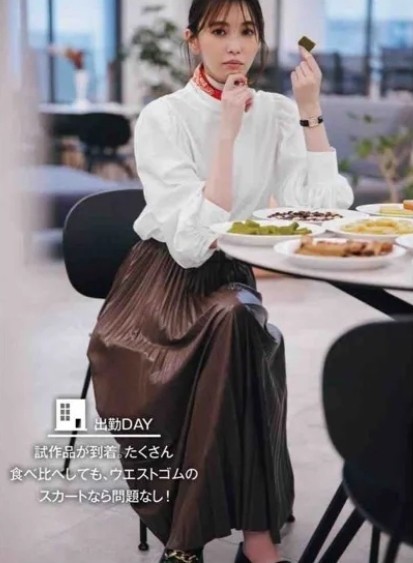 第2套:同色系穿搭,日杂示范的拿手好戏。一件杏色的衬衫,版型挺阔,剪裁精良,将衬衫的领子多解开几颗,让慵懒随性的风情萦绕身边,就这么一个小细节,让整件衬衫的质感瞬间提升。下面就选择同为大地色的咖啡色百褶裙,裙装的飘逸轻盈与衬衫的干净利落形成鲜明的风格对比,不经意地散发出优雅女人的气息。若是刚刚步入职场的年轻人,可以在下面搭配一双低跟的尖头鞋,俏丽大气有品位;但是对于中年女性来说,穿高跟鞋容易显老气,就换成小白鞋,休闲洒脱的模样超级减龄。