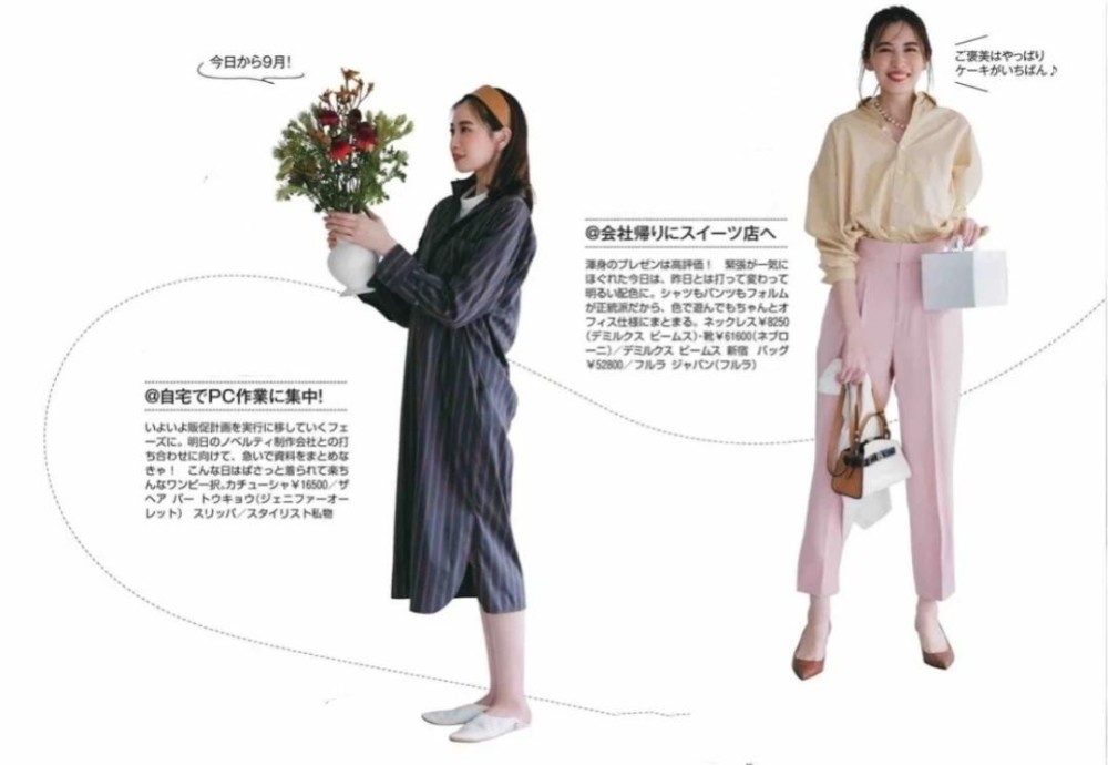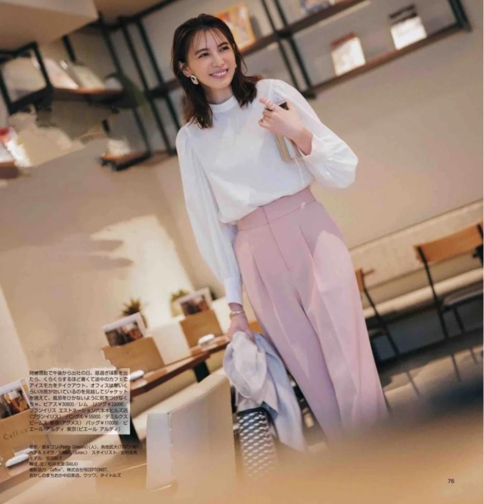第8套:经典款的魅力就在于随便两件衣服都非常配,杏色衬衫的慵懒高雅与粉色锥形裤的甜美大方,好似是天生一对,共同烘托着穿着者遗世独立的可爱日系形象。当两种彩色摆放在一起时,将两种颜色的饱和度降低就会十分和谐了。手拎包包、细腻露肤,亲切笑容,这些都是让整体更加时髦的关键因素。