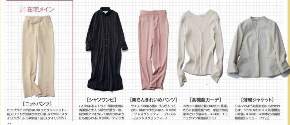 △米白色直筒裤、条纹衬衫裙、粉色锥形裤、米色针织衫、无领西装