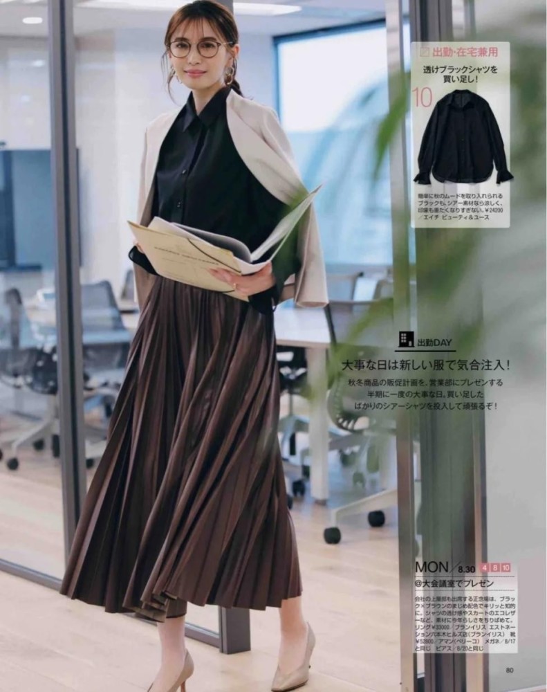第6套:成熟知性的女人,只有深色才能穿出气势,一件黑色衬衫+棕色百褶裙,稳重潇洒的气场慢慢浮现,脚下的高跟鞋是精致的彰显,这样一套Look走出去又贵又飒,极具女性的力量感和权威。